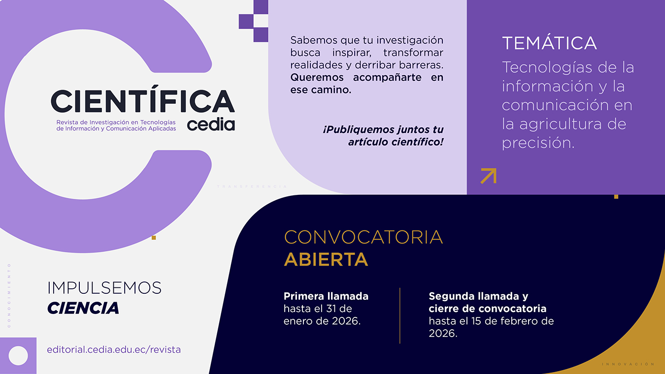 La revista CIENTÍFICA de CEDIA es una plataforma especializada en TIC y sus aplicaciones. Su propósito es fortalecer la visibilidad y el impacto de la investigación ecuatoriana, proyectándola hacia la comunidad académica y científica internacional.